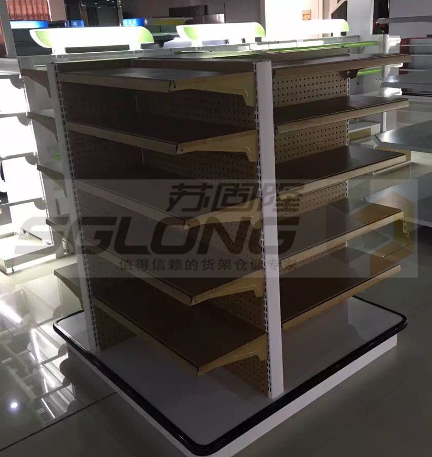 यह डबल-साइडेड गोंडोला शेल्फ एक छिद्रित बैक पैनल और एडजस्टेबल मेटल शेल्फ की सुविधा देता है, जो सुपरमार्केट और खुदरा दुकानों के लिए आदर्श है।
